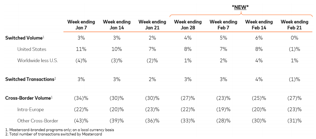 Purchase, N.Y. – February 25, 2021 – Mastercard today is updating its operating metrics through the week ending February 21. We continue to monitor the impact of the pandemic and related actions being taken by governments as it relates to border restrictions, social distancing measures and business operations, and the resultant impact on spending. We are seeing spending levels remain relatively steady to what they were earlier in the quarter, while year over year growth rates have improved modestly as we begin to lap the initial effects of the pandemic. We believe that most markets remain in the Normalization phase domestically, with some approaching Growth.* Progress through the phases may not be linear and we continue to monitor the situation closely.